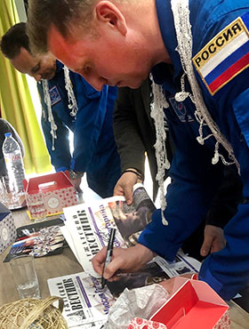 CosmonautsTo the moon and back! Chic Greek Gifts welcoming to Crete the Russian cosmonauts Alexey Ovchinin and Oleg Skripochka during a ceremony honoring Yuri Gagarin.